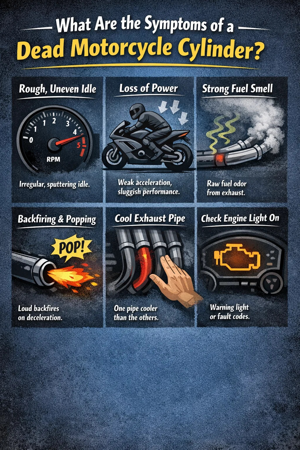 The most direct answer: if your motorcycle is running rough, has noticeably reduced power, smells like unburned fuel, or misfires at idle and under load, there is a strong chance one of your cylinders has stopped firing. This article walks you through every method to confirm it, what causes it, and how to resolve it.
