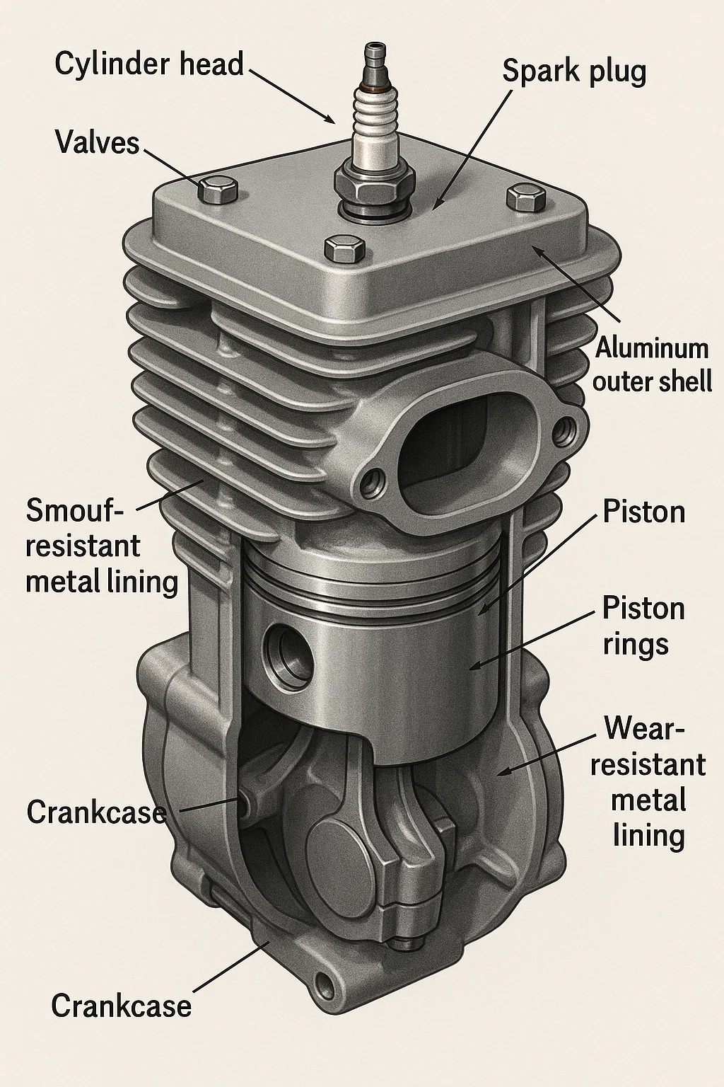 The cylinder has cooling fins (air-cooled, like fish scales) or a water jacket (water-cooled, containing coolant) to prevent high temperatures from melting the parts.