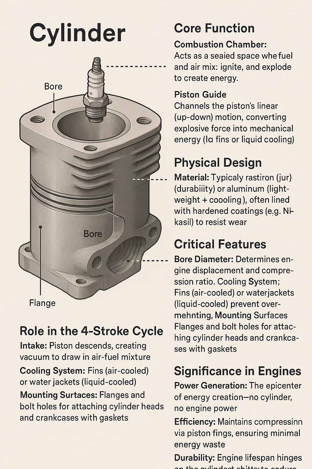 Piston Guide: Channels the piston’s linear (up-down) motion, converting explosive force into mechanical energy.